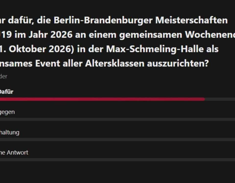 Die Umfrage zur möglichen neuen Ausrichtung der Berlin-Brandenburger Meisterschaften U11–U19 im Jahr 2026 ist abgeschlossen. Insgesamt haben 24 Personen aus verschiedenen Vereinen und Bereichen des BVBB an der Befragung teilgenommen. Vielen Dank für eure Teilnahme! Das Ergebnis ist deutlich: 20 Stimmen (83 %) sprechen sich dafür aus, die Meisterschaften aller […]